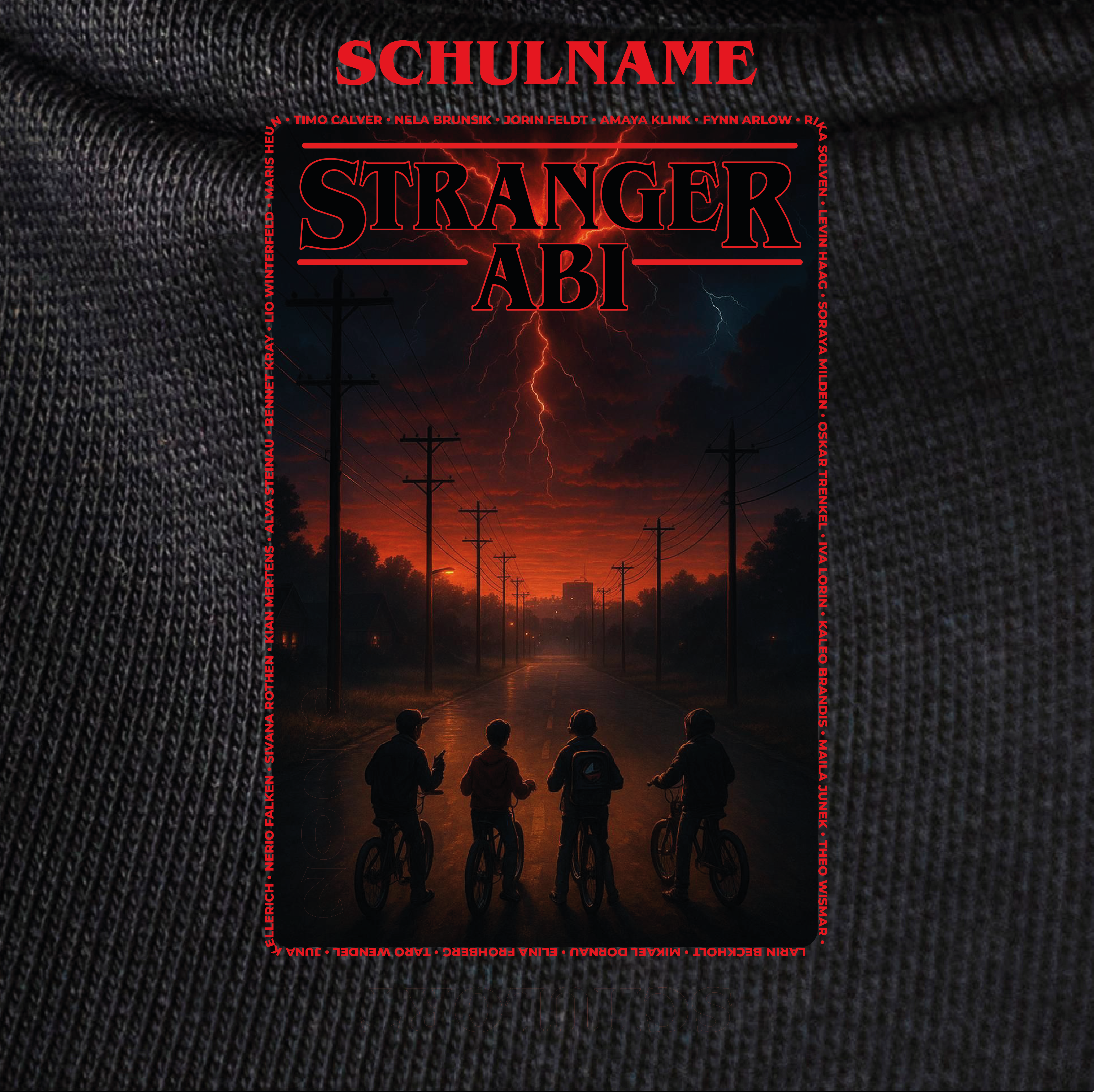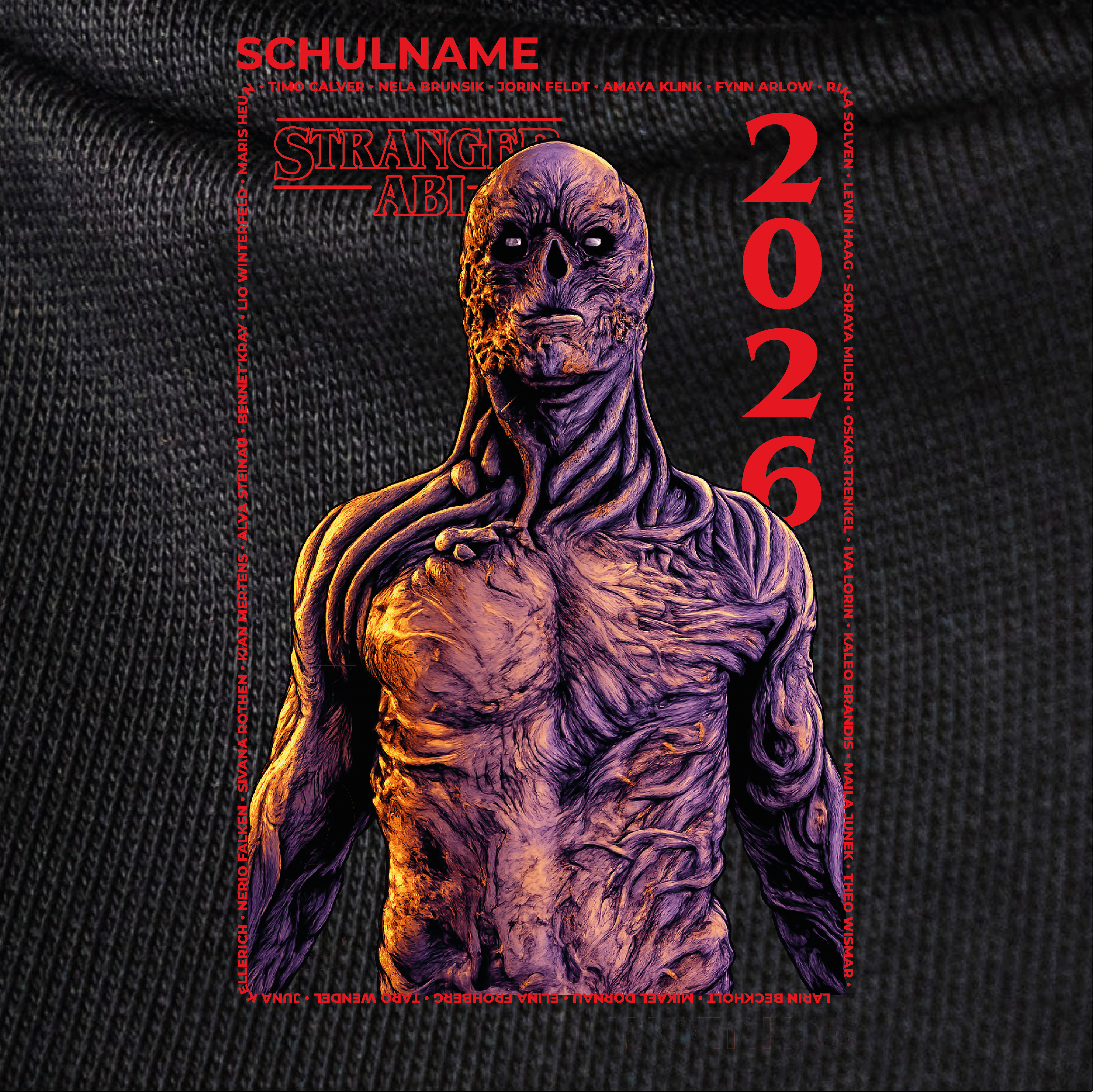 Ein düsteres, detailreiches Motiv mit einer bedrohlichen Kreatur aus dem Upside-Down. Das Design steht für das Unbekannte, Chaos und Durchhaltevermögen – perfekt als Statement-Print. Schulname, Abijahrgang und Namen rahmen das Motiv ein und machen es zu einem starken Gemeinschaftsdesign.